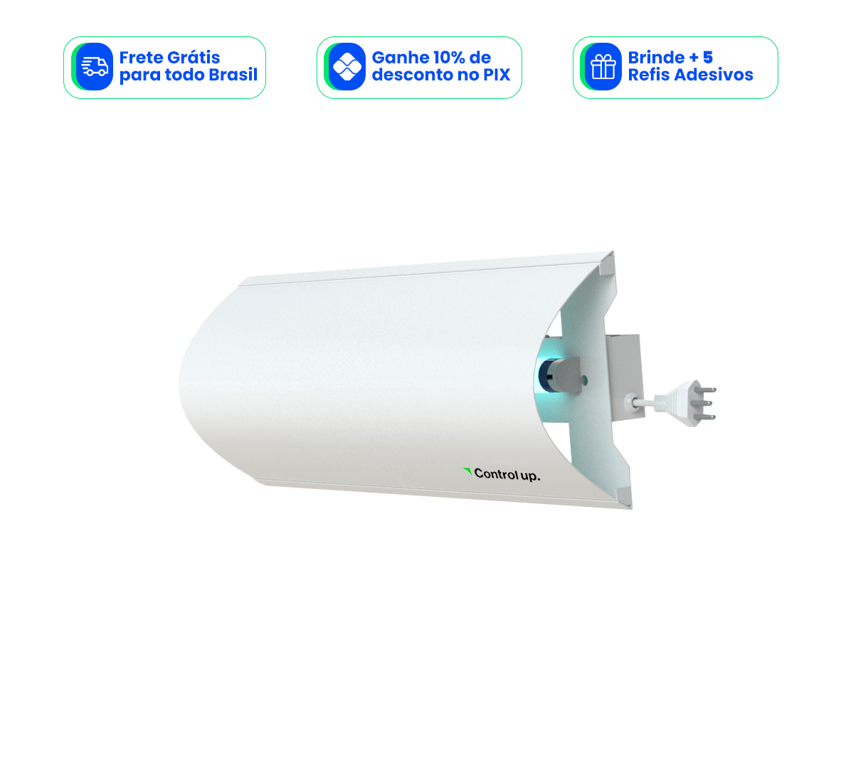 Pico de luz em 365 nm (UV-A) atrai os insetos; a placa adesiva captura de forma higiênica e silenciosa.